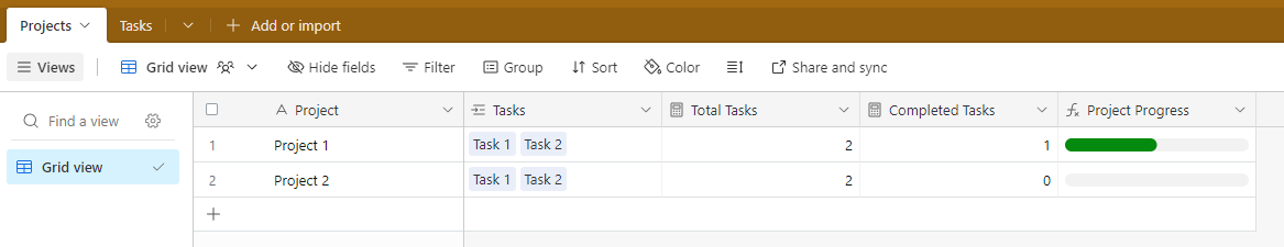 Before you get started, make sure you have at least a Project table and a Task table. The tasks should be linked to their associated projects, and should have a status column that indicates when the task is complete.