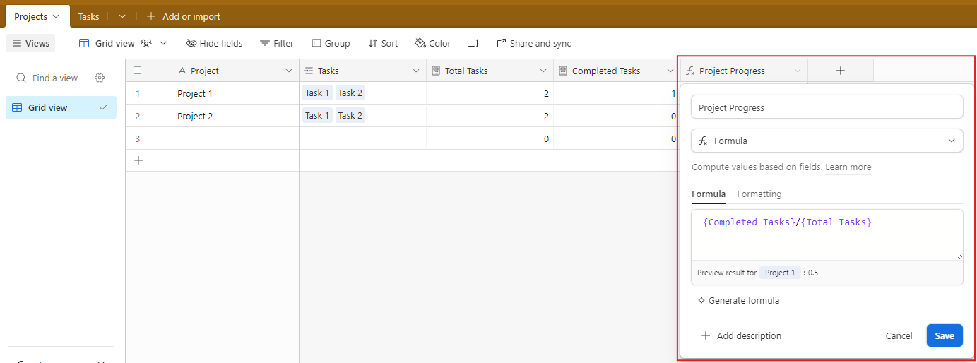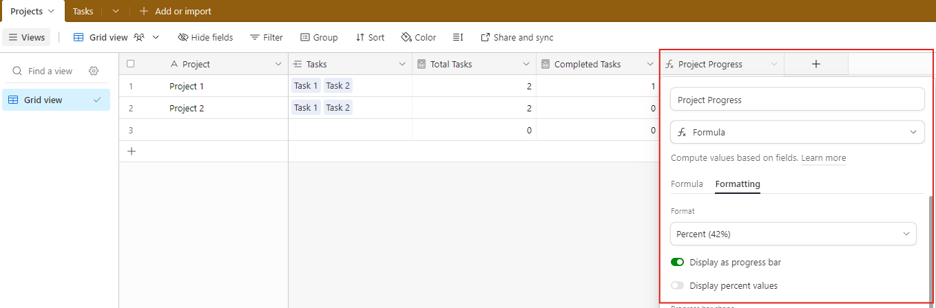 - Create a third field in Projects called “Project Progress” with field type Formula. In the Formula field, type {Completed Tasks}/{Total Tasks}.